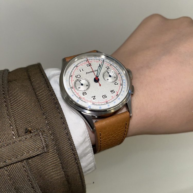 デザインは見ての通り、アンティーク感漂いまくり手巻きクロノグラフは当時のデザインを再現。ムーブメントはセリタ社のSW510 BH Bの手巻きムーブメントをトップグレードに仕上げたものを搭載。
