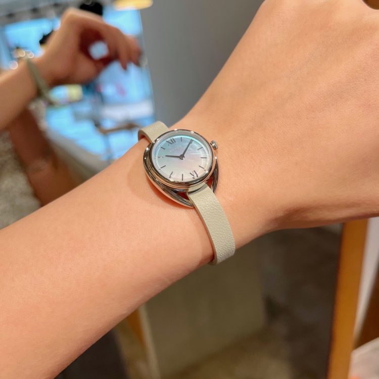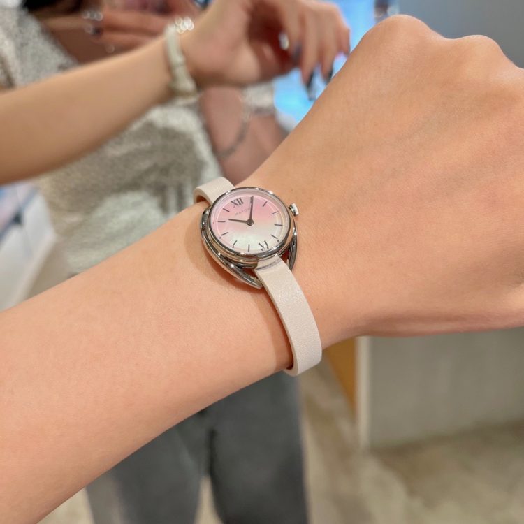 "恋人たちの花”ともいわれる「勿忘草」は柔らかな青紫系の色を、“撫でるほどにかわいらしい”という由来を持つ「撫子」はわずかに紫がかったピンク系の色をそれぞれ文字盤に採用し、従来のモデル同様にマザーオブパールを使用しているので光の当たる角度によって色味が変わる唯一無二のデザインです(*^-^*)