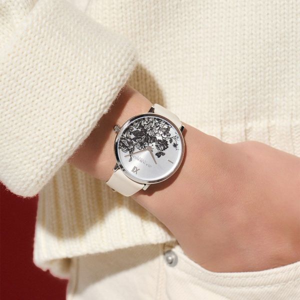 クリームがかった淡いベルトにシルバーと黒をコントラストに花々が際立つ文字盤がとても素敵です✨