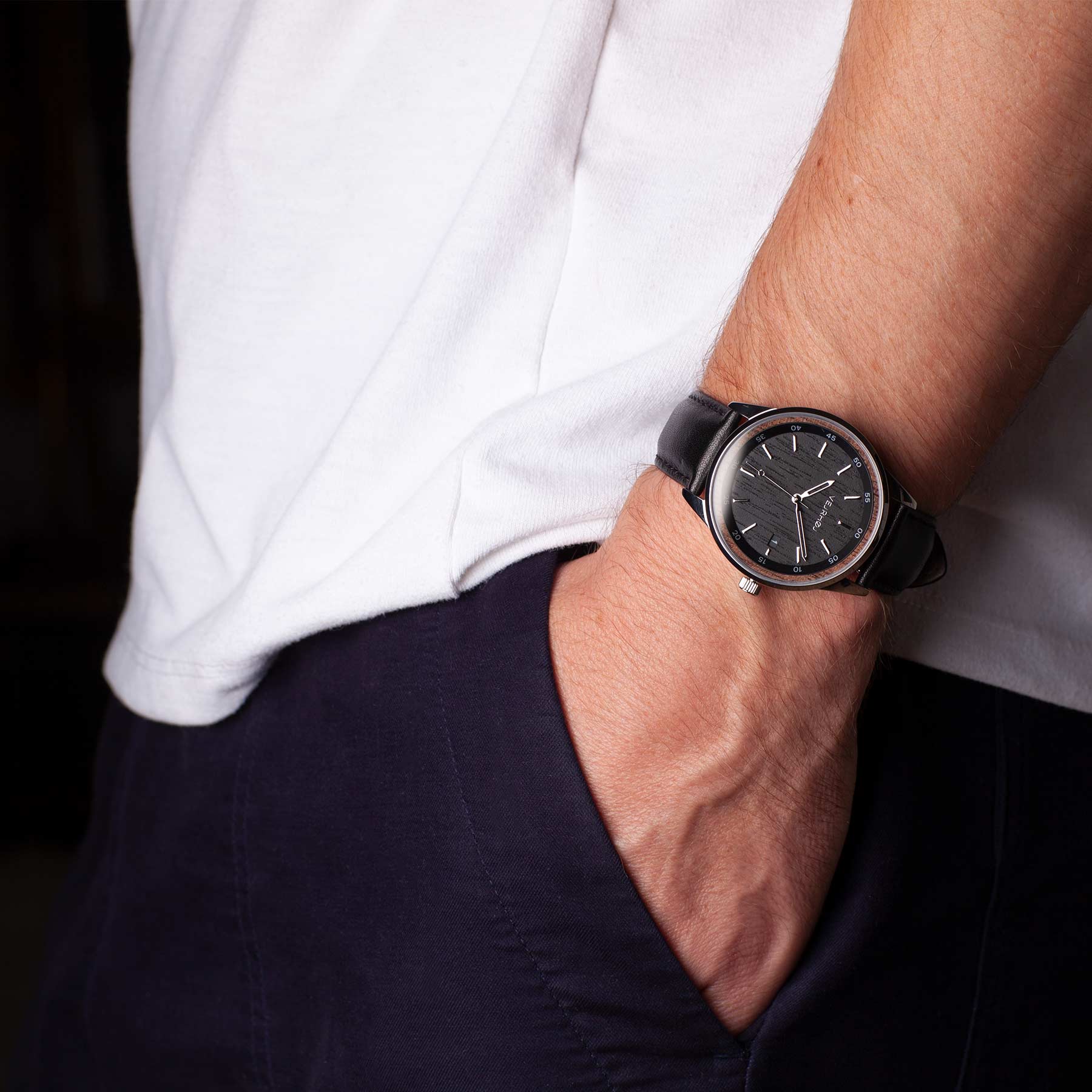 文字盤には黒染めした天然くるみ材を採用し、ステンレスとの融合が美しいデザイン。