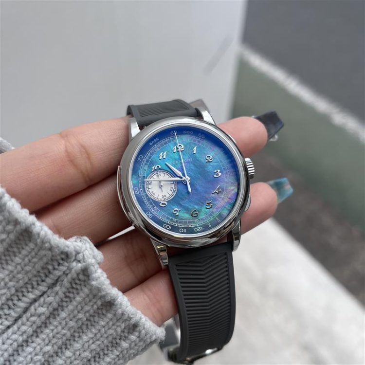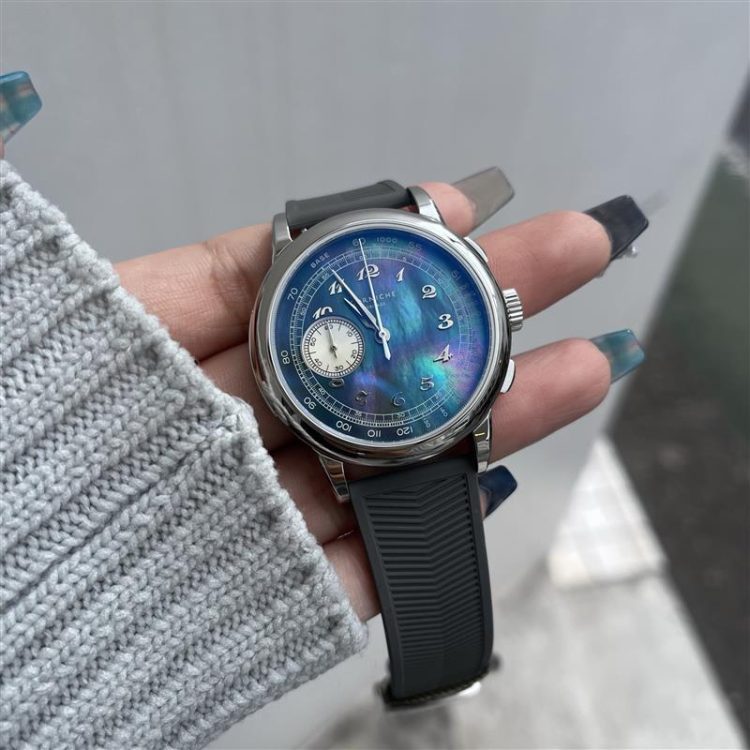 今作は文字盤にブラックマザーオブパールを使用したなんとも幻想的的なデザインへと仕上がりました・・アベンチュリンと同様にひとつひとつかなり個体差があり、唯一無二の1点物となります!!