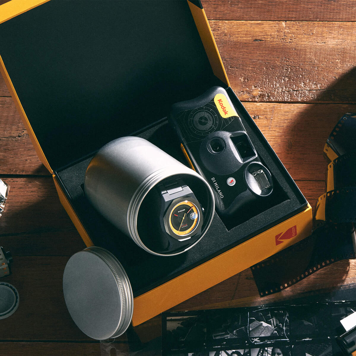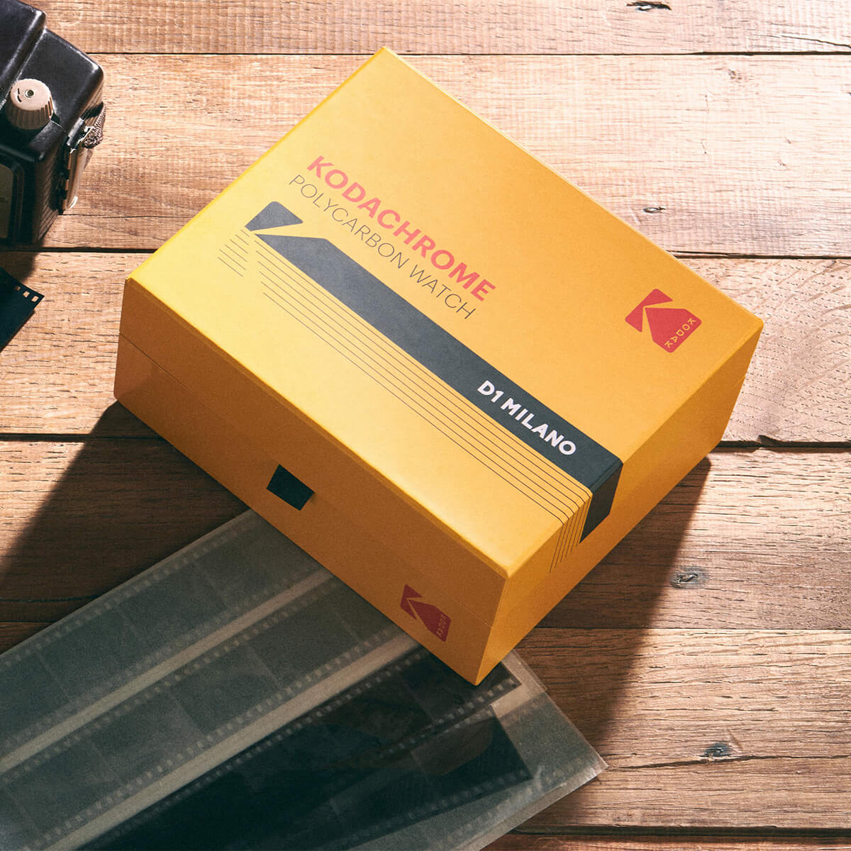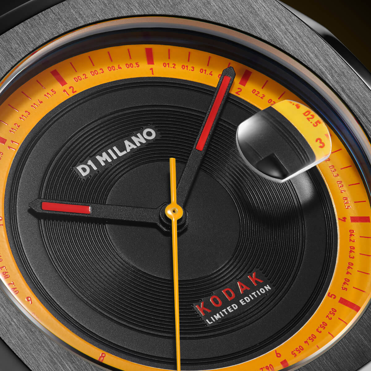 赤と黄色の文字盤と対照的な黒いボディはコダックのブランドアイコンでもあるトレードカラーを採用し、遊び心を表現しながら、ディーワンミラノの人気シリーズ、ポリカーボンのボディをベースに2つのDNAが見事に調和され、より美しいデザインに仕上げられました!