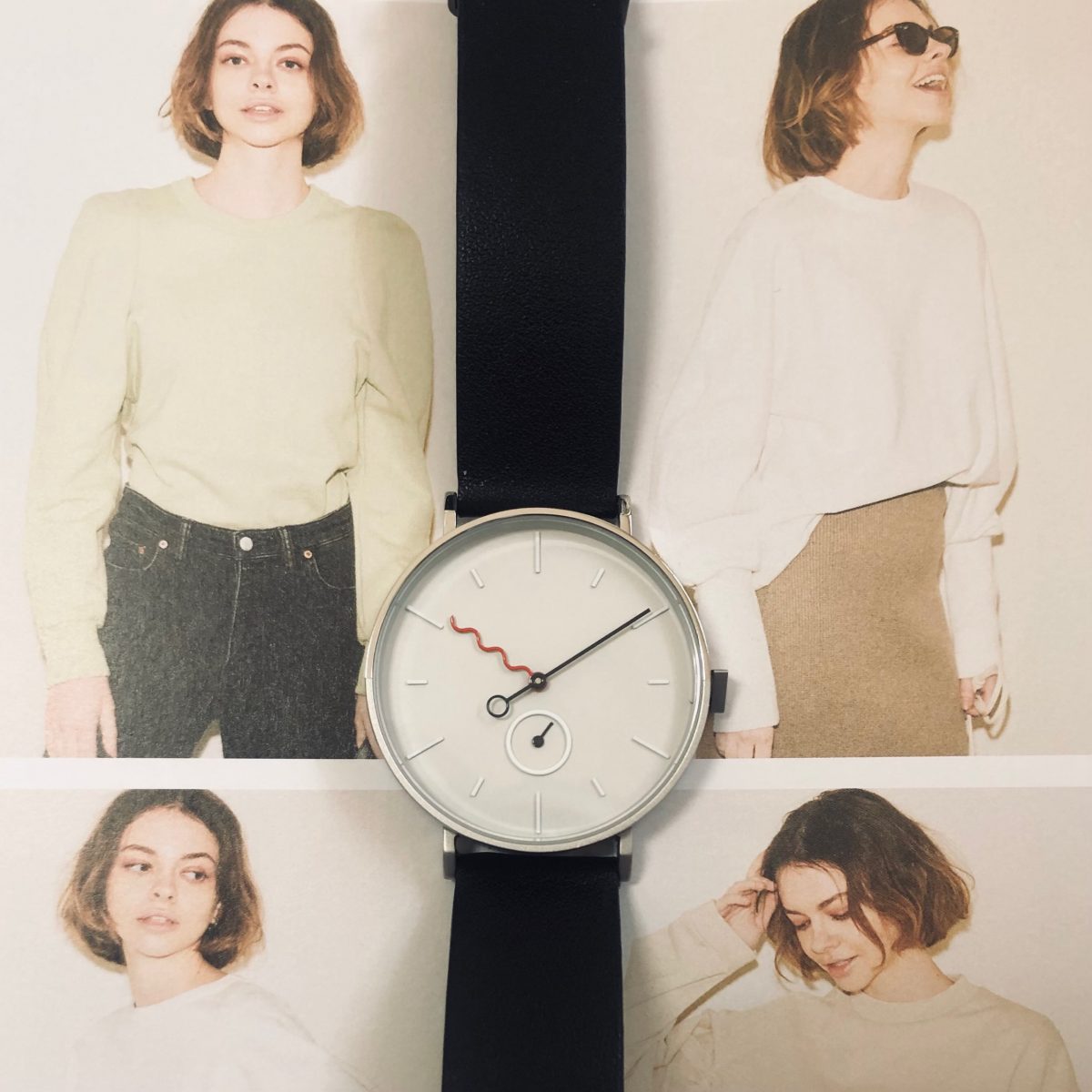 なんといっても、フニョフニョっとした短針の赤色と、6時の上にある丸の中の秒針がこじゃれた印象を与える時計です♡