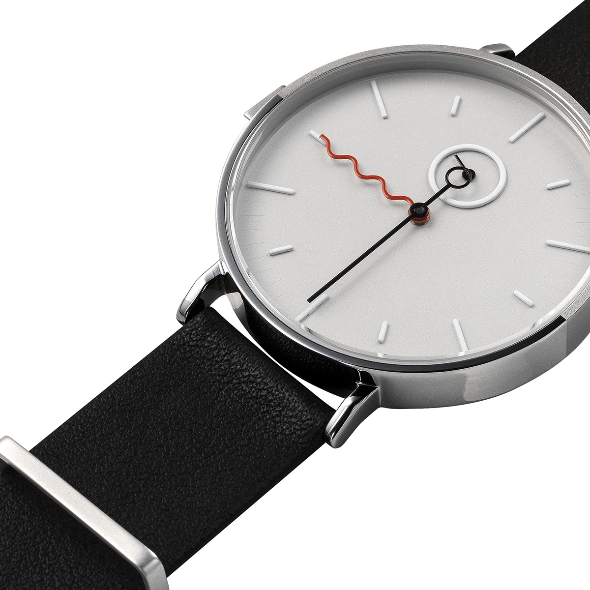 シルバーのケースは上下で艶ありなしの立体的に感じるデザインになっていて、フニョフニョの短針は赤色でモノトーン系の中でアクセントになります。