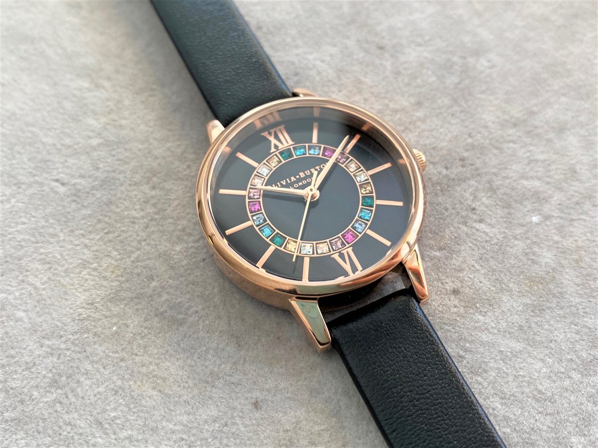 ブラックのマザーオブパールの文字盤にレインボーのクリスタルが映えていて、