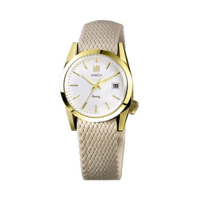 ケースはモダンな風防でありながら、ベルトにはナイロンベルトを合わせており