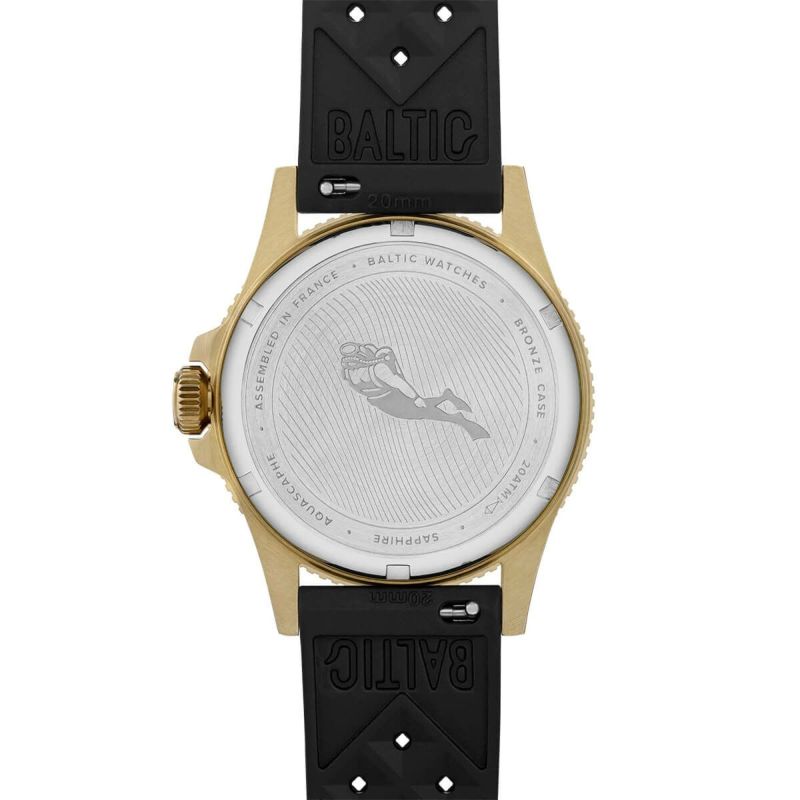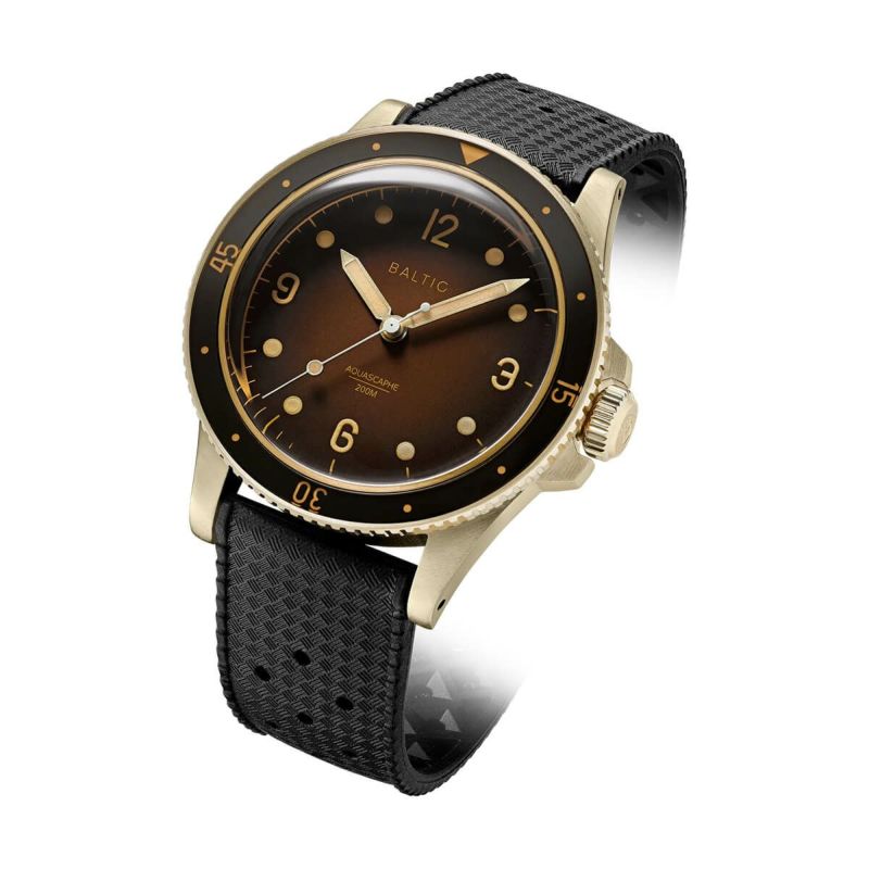 BALTICの人気シリーズ「AQUASCAPHE(アクアスカーフ)」。その中でも経年変化を楽しめるブロンズケースを採用した新作が登場。従来のモデルではベゼルもブロンズを採用していたが今回のモデルはサファイアインサートベゼルになっている。