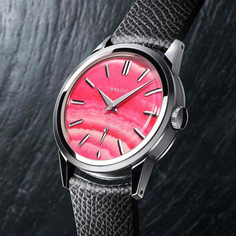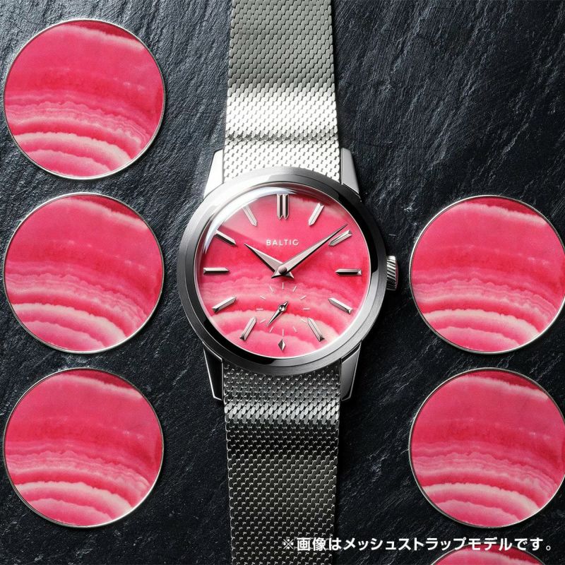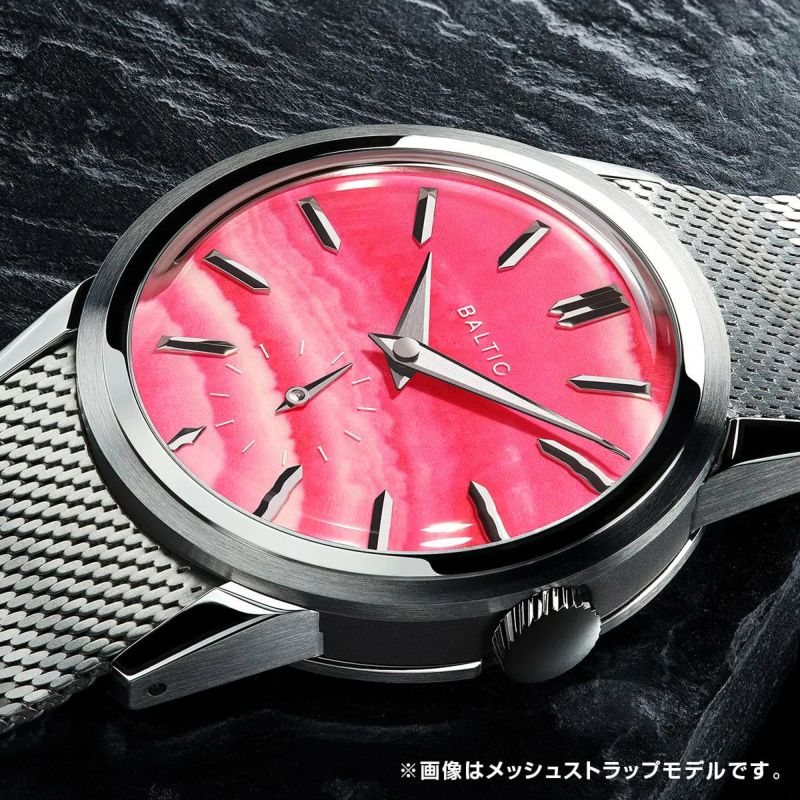 穏やかなピンクの地色に、天然石ならではの内包物が浮かび上がるダイヤルは、クラシックでありながら現代的な個性を感じさせます。