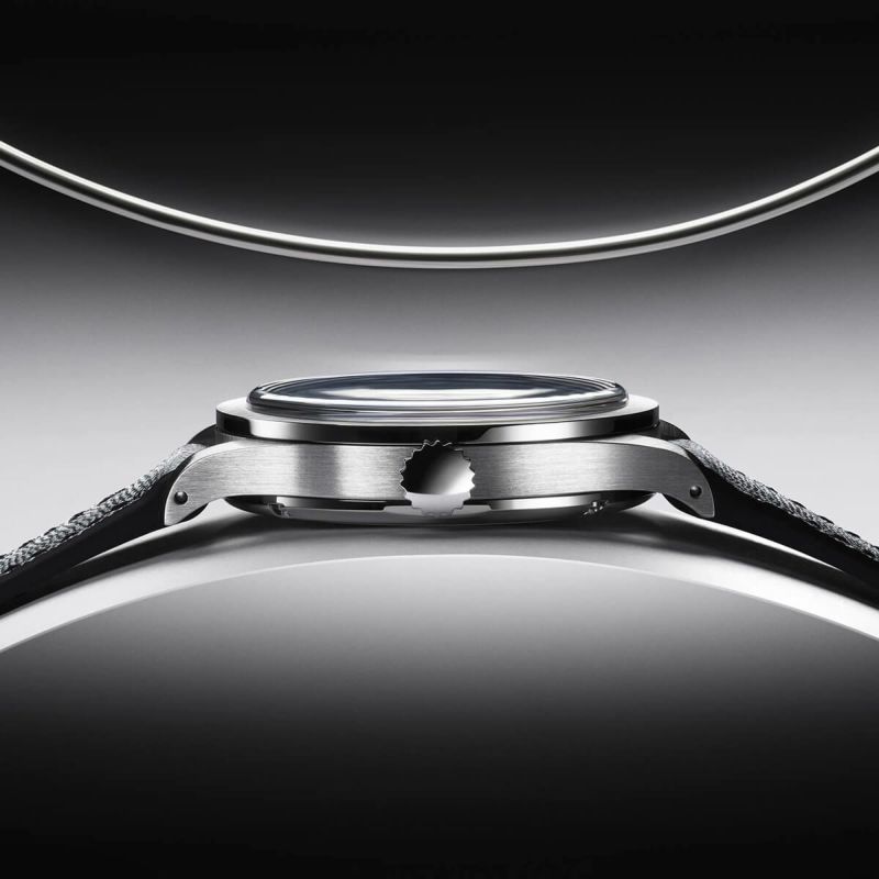 直径36mmのスチール製ケースには、縦方向にブラシ仕上げされたベゼルが付いており、円形ブラシ仕上げのラグ上部と質感の美しい相互作用を生み出しています。