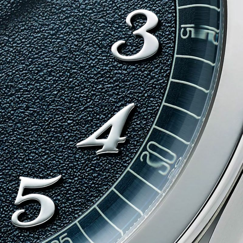 時刻はシルバーの時針と分針で表示され、7時位置にはサブセコンドカウンターを備えています。リーフ針は面取りされ、秒カウンターにはギョーシェ仕上げが施され、文字盤の中で際立っています。