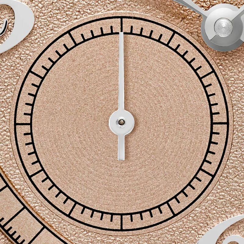 時刻はシルバーの時針と分針で表示され、7時位置にはサブセコンドカウンターを備えています。リーフ針は面取りされ、秒カウンターにはギョーシェ仕上げが施され、文字盤の中で際立っています。