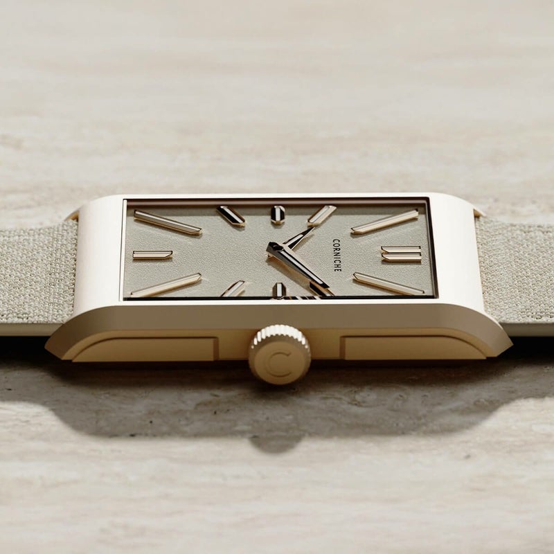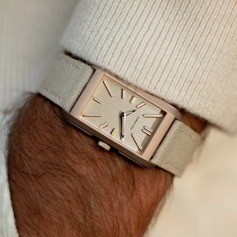 Visionnaire Rose Gold with Sand Dial は、フォーマル専用の時計ではありません。スポーティな装いにも、きれいめなスタイルにも、無理なく溶け込む。「今日はどちらの世界で過ごすか」そんな問いに、静かに寄り添ってくれる時計です。エレガンスとスポーツの間。その曖昧で心地よい領域を、CORNICHEらしい感性で形にしたモデルと言えるでしょう。