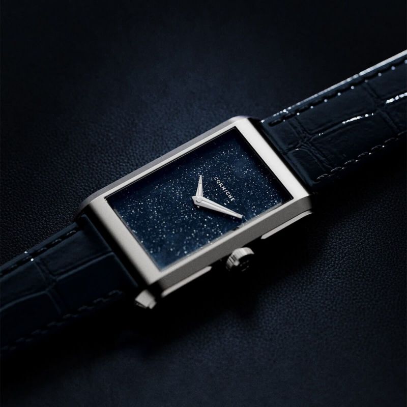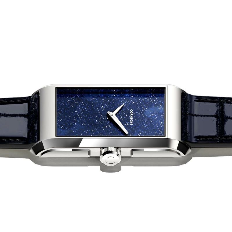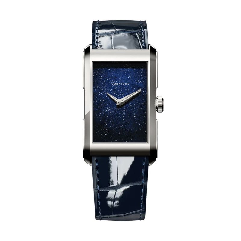 CORNICHE が描く Visionnaire は、主張を抑えたシンプルさの中に、確かな存在感を宿したコレクションです。この Polished Steel & Aventurine は、その中でもとりわけ「夜の時間」によく似合うモデル。磨き上げられたステンレススチールケースは、まるで液体のように光を反射し、文字盤には、深いネイビーのアベンチュリンガラスを採用しています。インデックスを排したミニマルなダイヤルに、星屑のように散りばめられた微細な輝き。それは決して派手ではなく、静かな夜空を思わせる奥行きを生み出しています。