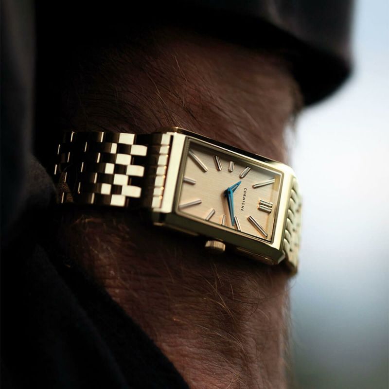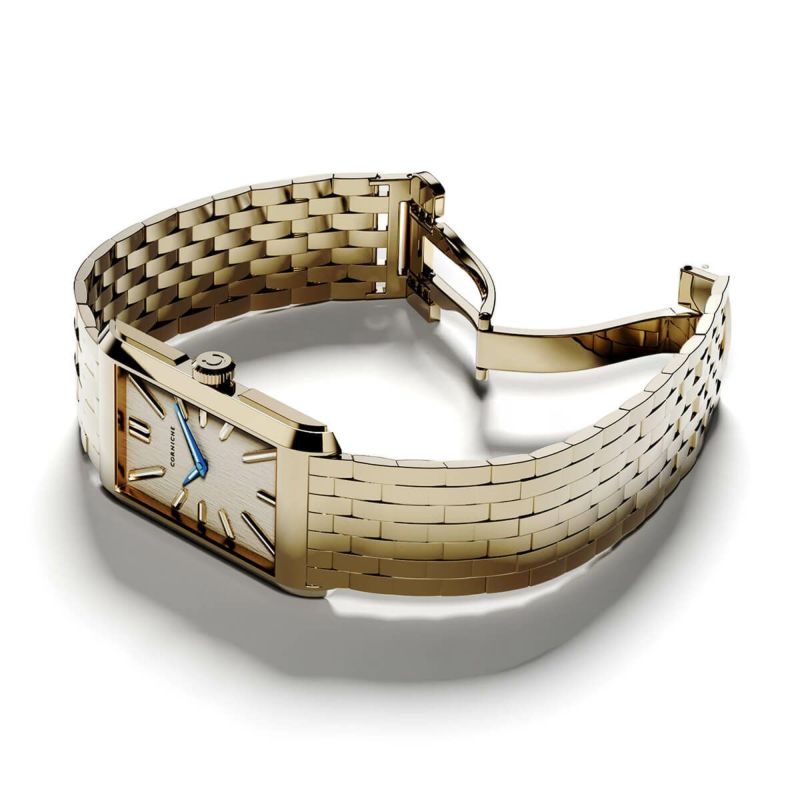 CORNICHE の Visionnaire コレクションにおいて、この Yellow Gold on Bracelet は、最も存在感がありながら、同時に最も「抑制の効いたゴールド」を体現した一本です。全面ポリッシュ仕上げのイエローゴールドPVDケースとブレスレット。一見すると華やかですが、その印象が過剰にならないのは、Visionnaire特有のコンパクトなプロポーションと、研ぎ澄まされたケース造形があるからこそ。ドレスに寄りすぎず、スポーツにも振り切らない。このモデルは、ゴールドウォッチに対する先入観を心地よく裏切ってくれます。