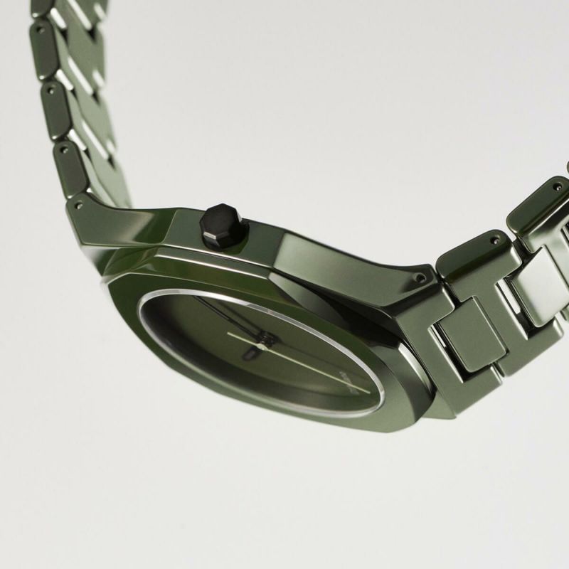 マットカラーの文字盤が、光沢のあるセラミック製ケースやストラップと対照的に配置され、強いインパクトと調和のとれた美しさを演出。