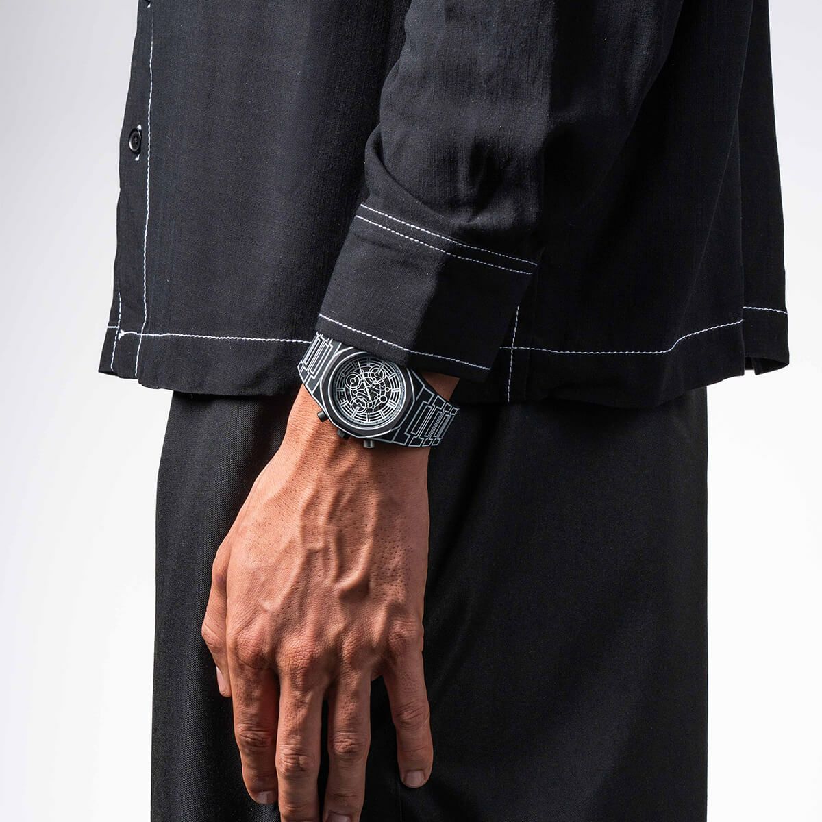 ムーブメントを垣間見せながらも、モノクロームの調和を崩さず、素材と想像力を融合させた大胆かつ洗練された仕上がりとなっています。