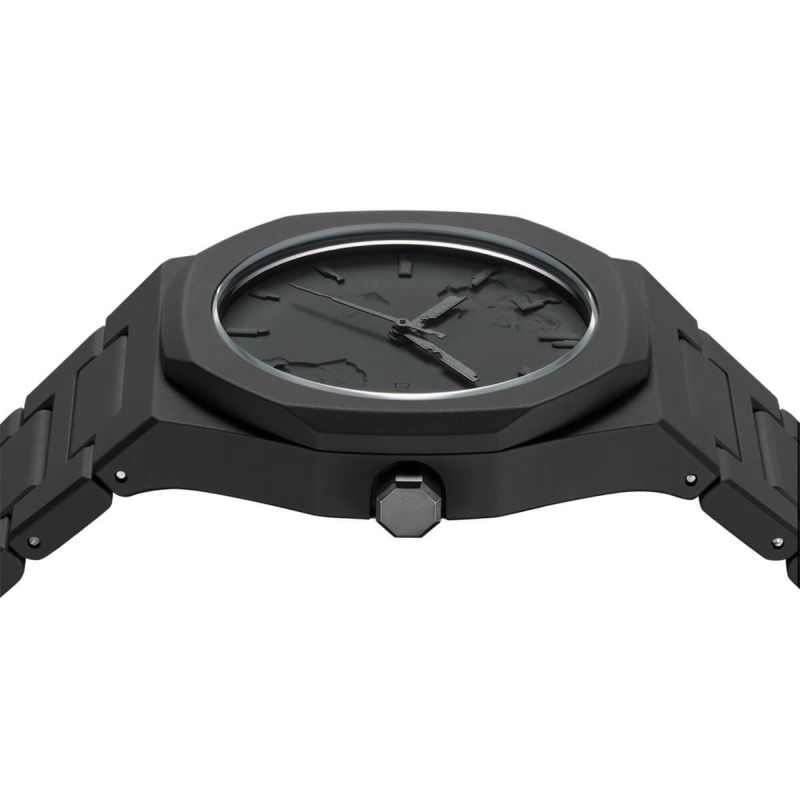 ブラックダイヤルに施された3Dブロークンストーン(砕石)テクスチャーが個性と存在感を際立たせながらも、軽量なポリカーボネート構造を保っています。