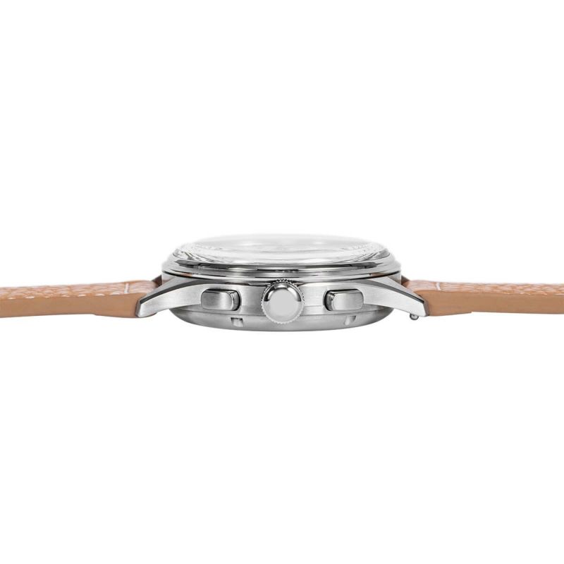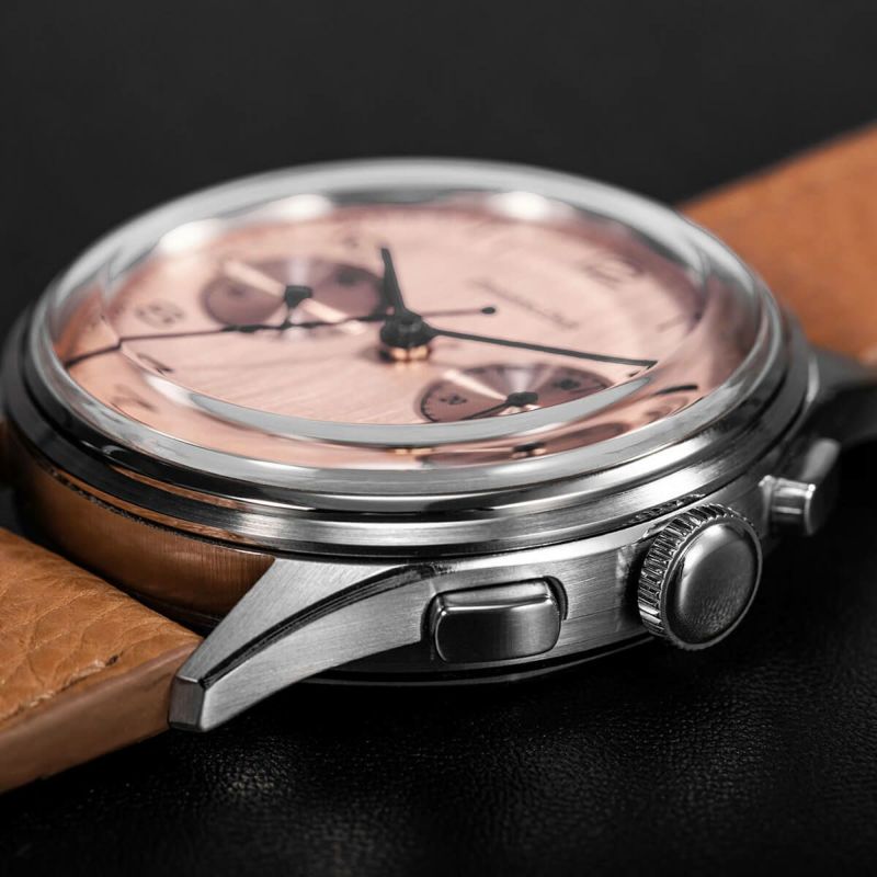 1866年にスイスのサン・ティミエ創業したクロノグラフ専門メーカーで数多くの有名ブランドにムーブメントを供給していたExelsior Park。クオーツショックの影響により一度幕を閉じた同ブランドが2020年に復活を遂げた。当時のいで立ちはそのままにインデックスをアプライト調にしダイヤルの散在感を強調、ケースサイズは39.8mmに抑えた小ぶりなクロノグラフを完成させた。 EP95004は、1950年代の時計製造のクラシックで、素晴らしく、非常に読みやすいブラシドサーモンの文字盤を特徴としています。ダブルドームのサファイアクリスタルで覆われ、防反射処理も施されています。手巻きのツインカウンタークロノグラフは、炎色仕上げの針が装備されています。スイス製のSellita SW510 BH Bムーブメントで動き、品質と永遠の象徴です。