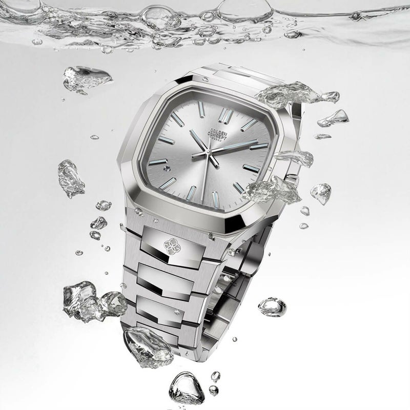 ケースとベゼルには、高級時計にも採用される904Lステンレススチールを使用。深い鏡面仕上げが美しさを長く保ち、100m防水の実用性も備えています。