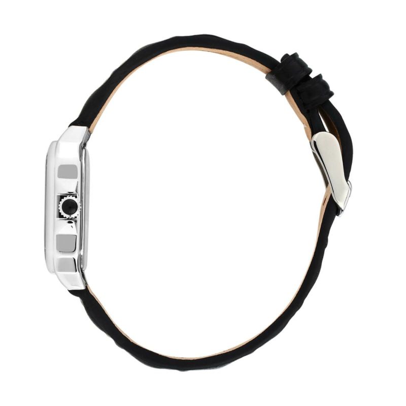 ブラックまたはホワイトで展開されるエレガントなレザーベルトモデルは、バゲットクリスタルやバトンインデックスが特徴。