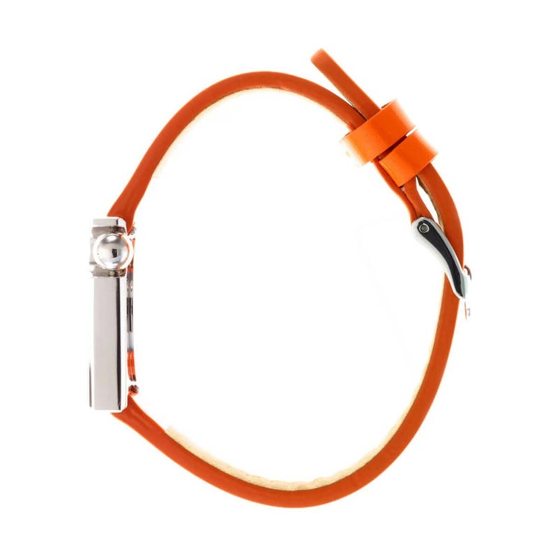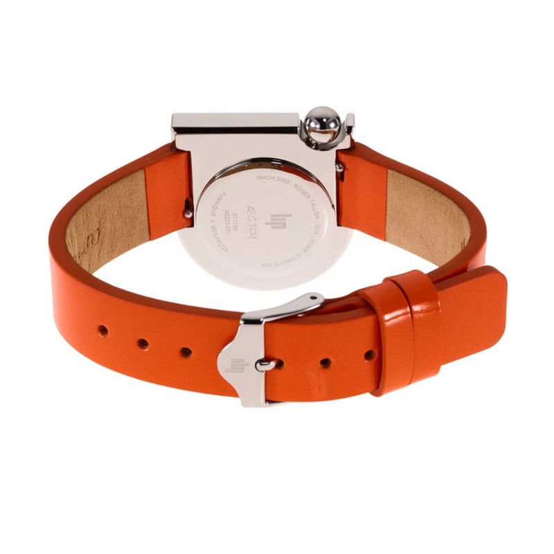 Mach 2000 Mini Moon は、現代的でアシンメトリーなシルエットが際立つ、遊び心あふれるデザインウォッチです。316Lステンレススチール製のポリッシュケースに、シルバーの文字盤と針(ブラックの時針のみ強調)が組み合わされ、特許取得のオレンジレザーストラップが鮮烈なアクセントを添えます。