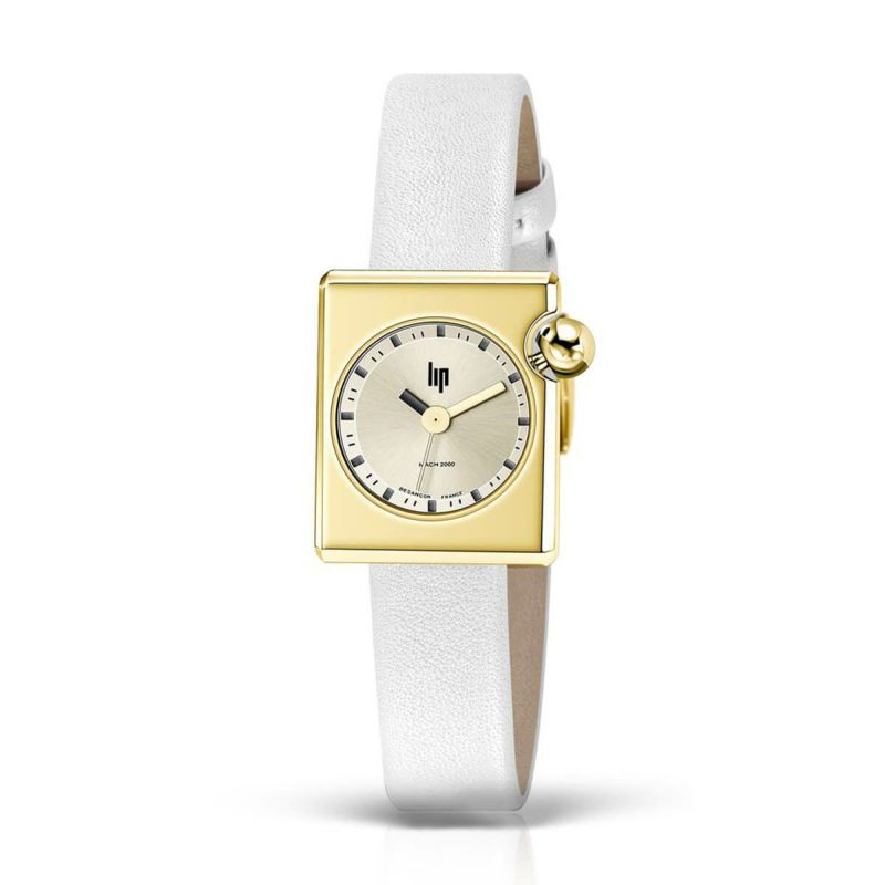 このLip Mach 2000ミニスクエアモデルは、ゴールドケースとホワイトレザーストラップを採用した、トレンド感あふれるデザインが魅力です。レトロな雰囲気を漂わせながらも、大胆な印象を与えるこの時計は、女性の手元を個性的に演出します。