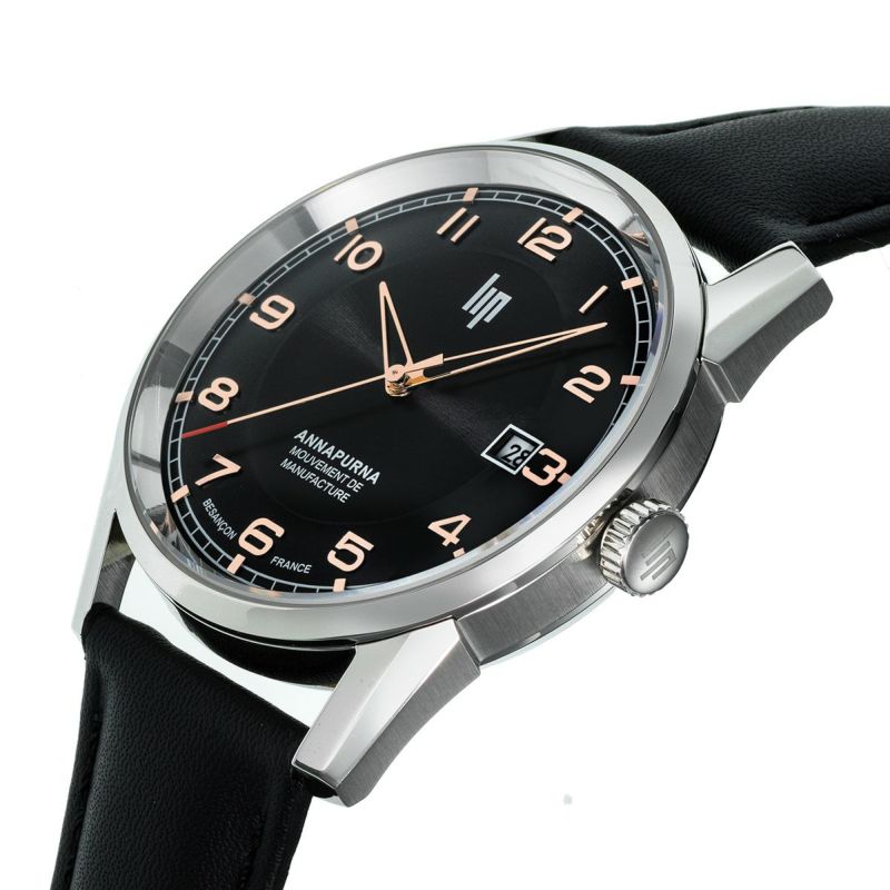裏蓋はシースルー仕様となっており、精度向上のため毎時21,600振動(3Hz)で鼓動する大きなテンプと、動きに合わせて表情を変えるLIPロゴ入りローターを堪能できます。防水性能は日常使いに安心な5気圧(50m)、本格機械式ながらも幅広いシーンで活躍する一本。ブラックのレザーストラップには、LIPオリジナルのクローム仕上げアルディロンバックルを装備。