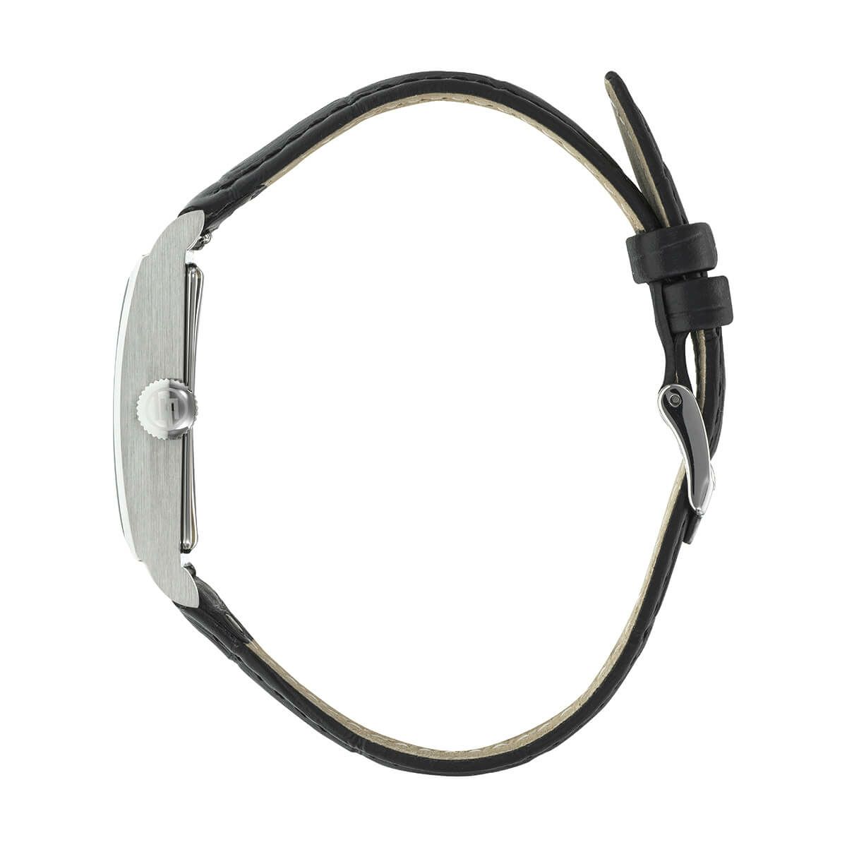 ストラップには、クロコ型押しのマットブラックカーフレザーを採用。