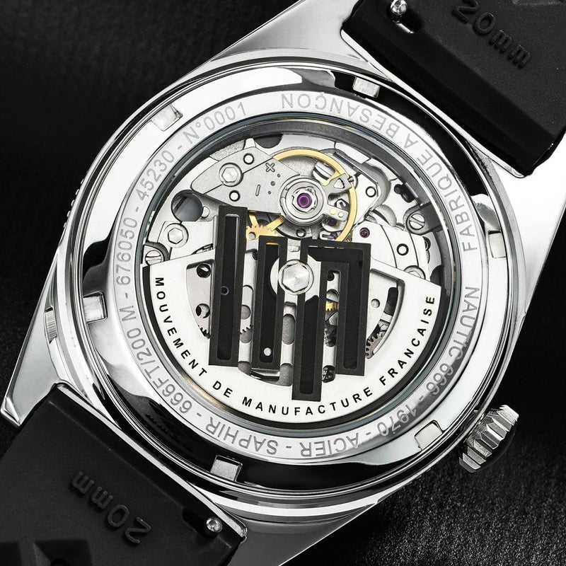 1960年代後半、北米市場向けに開発され「Devil Diver(悪魔のダイバー)」の愛称で知られる「Nautic 666」は、200メートル防水を誇るダイアル表示でその名を馳せた名作。この最新モデルでは、39mm径の316Lステンレススチール製ケースにサテン仕上げを施し、120クリックの逆回転防止ベゼル(ブラックアルマイト加工インサート付)を装備した本格ダイバーズとして蘇りました。