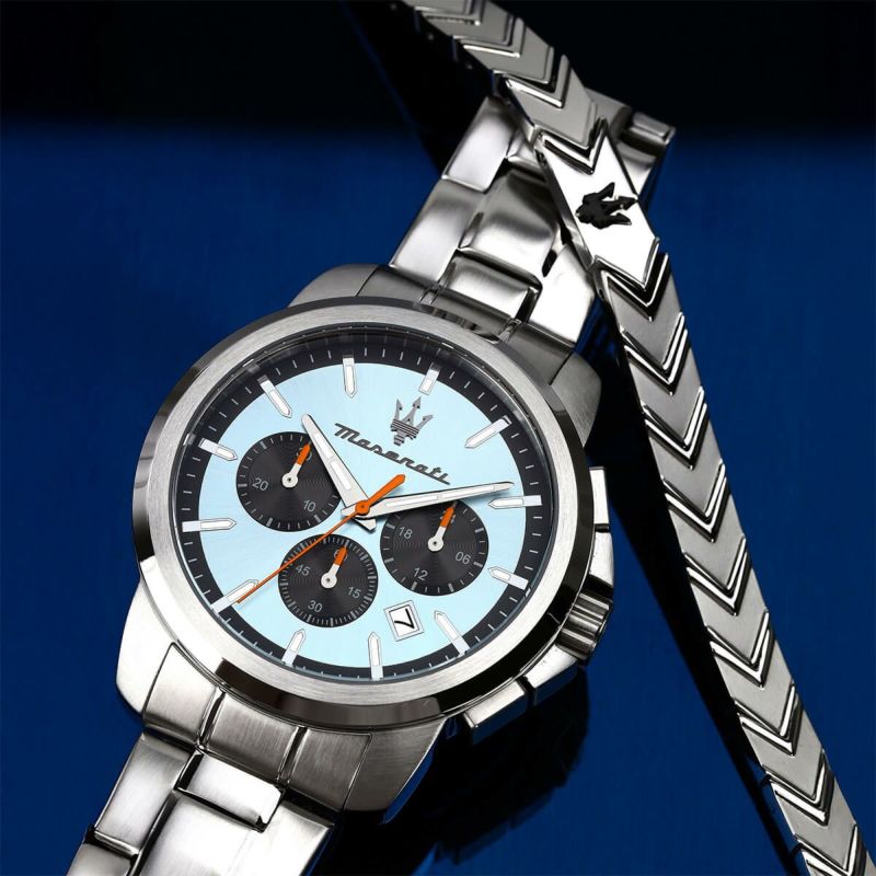 Maserati / マセラティ 【スペシャルパッケージ(時計+ブレスレット)】スクセッソ 42MM クロノ ブルー ダイヤル シルバー ブレスレット + アイコニック メンズ ブレスレット シルバー ブラック