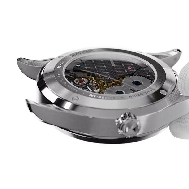 ケースは10.6mm厚のステンレススチール製で、オリオン宇宙船の流線形を思わせるポリッシュとサテン仕上げの融合が美しく手首に馴染みます。