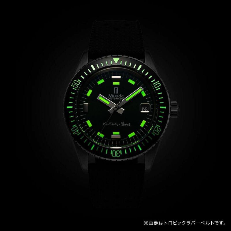 さらに、オリジナルバージョンへのもう一つのオマージュは、手書き風のロゴです。6時の「Antarctic Diver」ラベルは、オリジナルを忠実に再現したヴィンテージ風のタイポグラフィを使用し、12時の「Nivada Automatic」はカリグラフィ調の文字で、オリジナルの精神をしっかりと守っています。