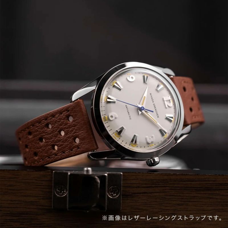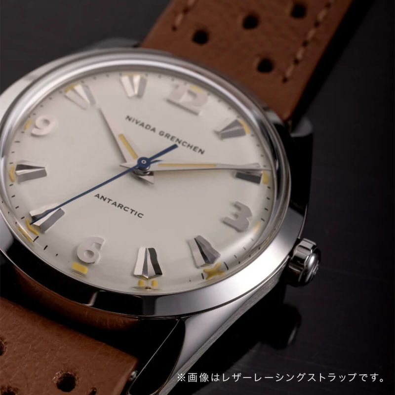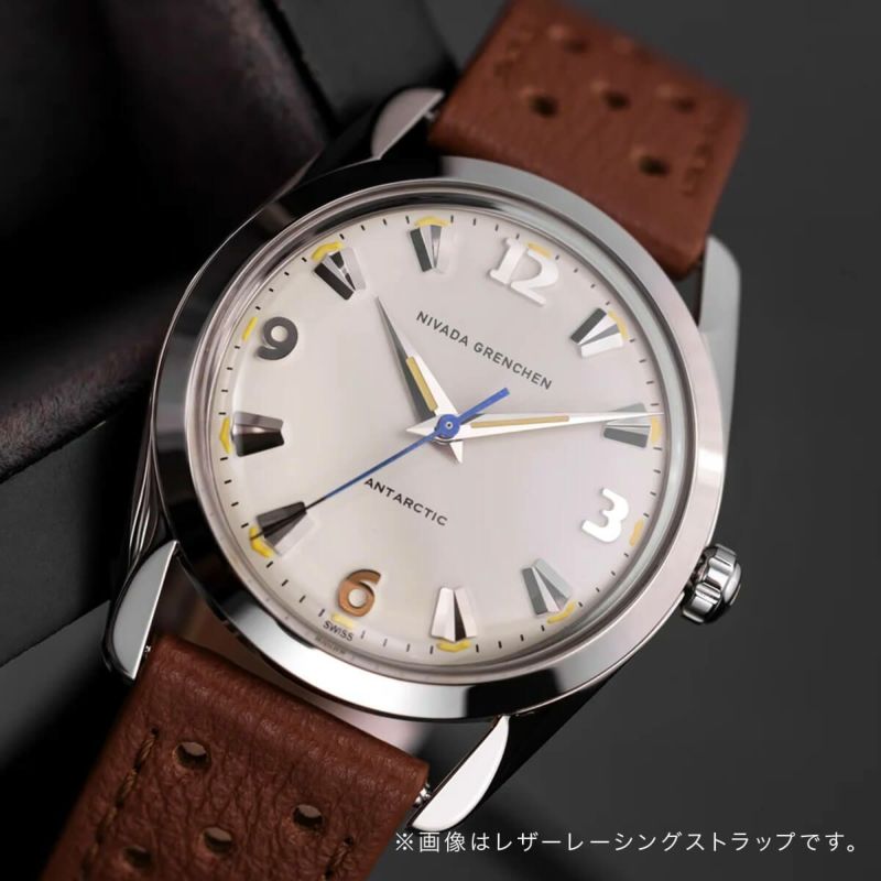 文字盤の12時位置の下には「Nivada Grenchen」のサイン、6時位置のすぐ上には「Antarctic」の文字が堂々と配され、その下にはミニッツトラックの外縁に沿うように「Swiss」の文字が控えめに配されている。