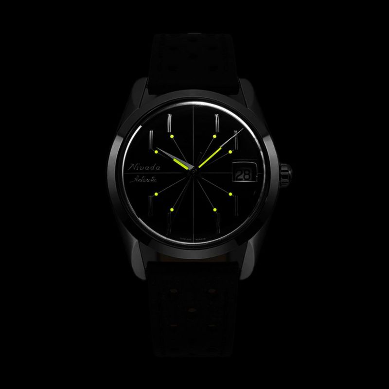 このダイヤルは、過去も現在も、Nivada Grenchenが試みた中で最も大胆で個性的なデザインの一つです。シルバーのサンレイブラッシュダイヤルに縦に配置された8つのインデックスが特徴で、文字盤の中心に向かって伸びる8本の「スパイダーレッグ」がすべてをつなぎます。スーパールミノバで強化された「ドーフィン」針が付属し、Spiderを着用すると、どこへ行っても注目の的になるでしょう。