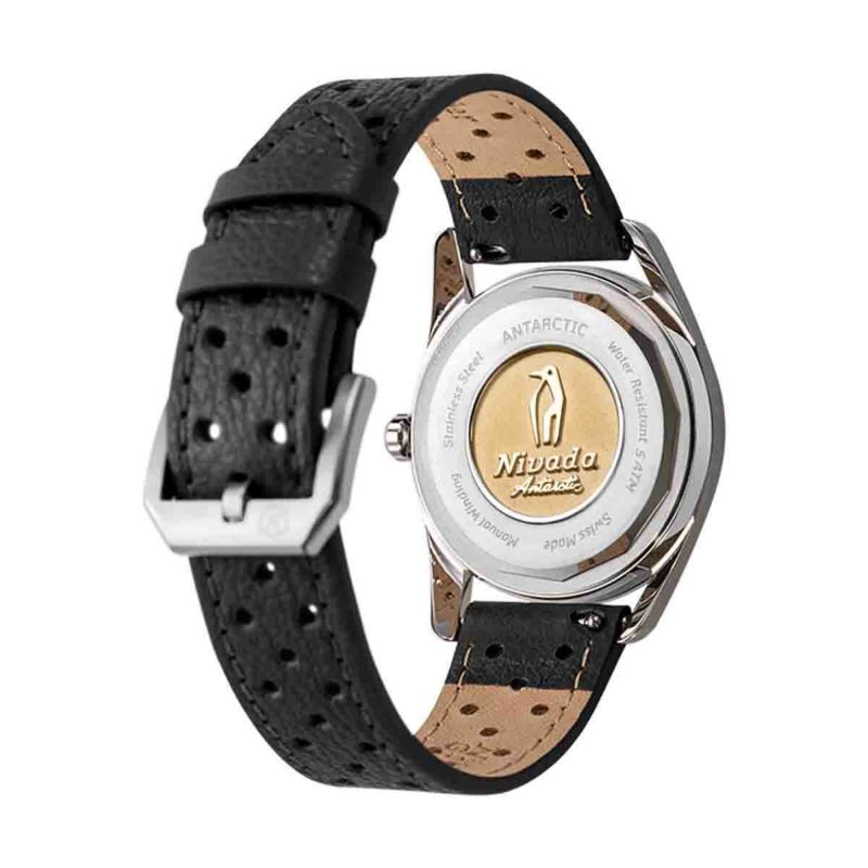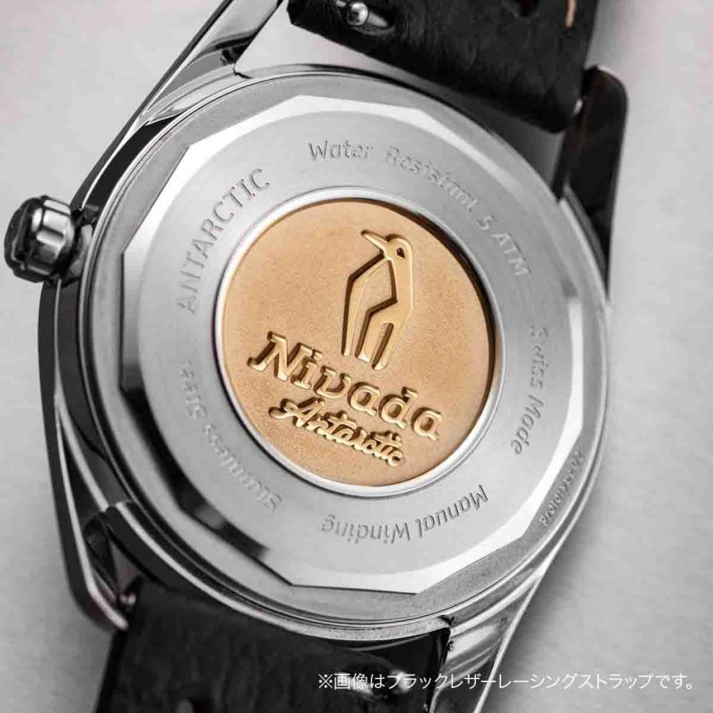 Antarctic Spiderは、直径35mmで磨かれたブラシ仕上げのシルバーステンレススチールケースを特徴とし、厚さは11.1mmです。ダイヤルは、ダイヤモンドほどの硬さを持つサファイアクリスタルで覆われており、日常の衝撃や傷から保護します。50メートル(5気圧)まで防水。3時の位置には日付窓があり、9時の位置にはブランドのサインがあります。