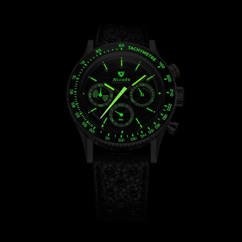 明るいクロノグラフカウンターとのコントラストが際立ち、Super-Luminova針とインデックスがあらゆる光環境で高い視認性を確保します。
