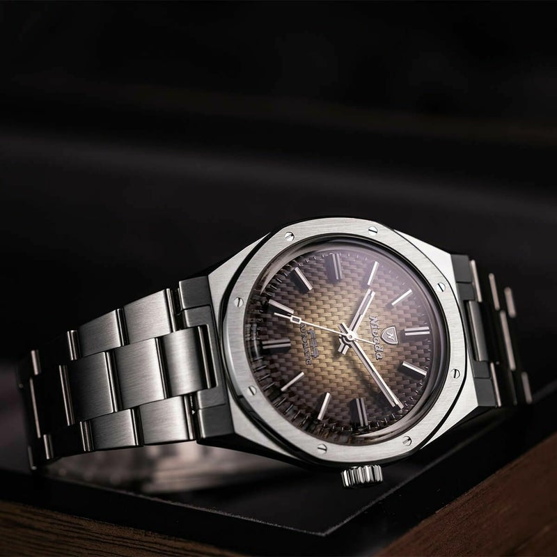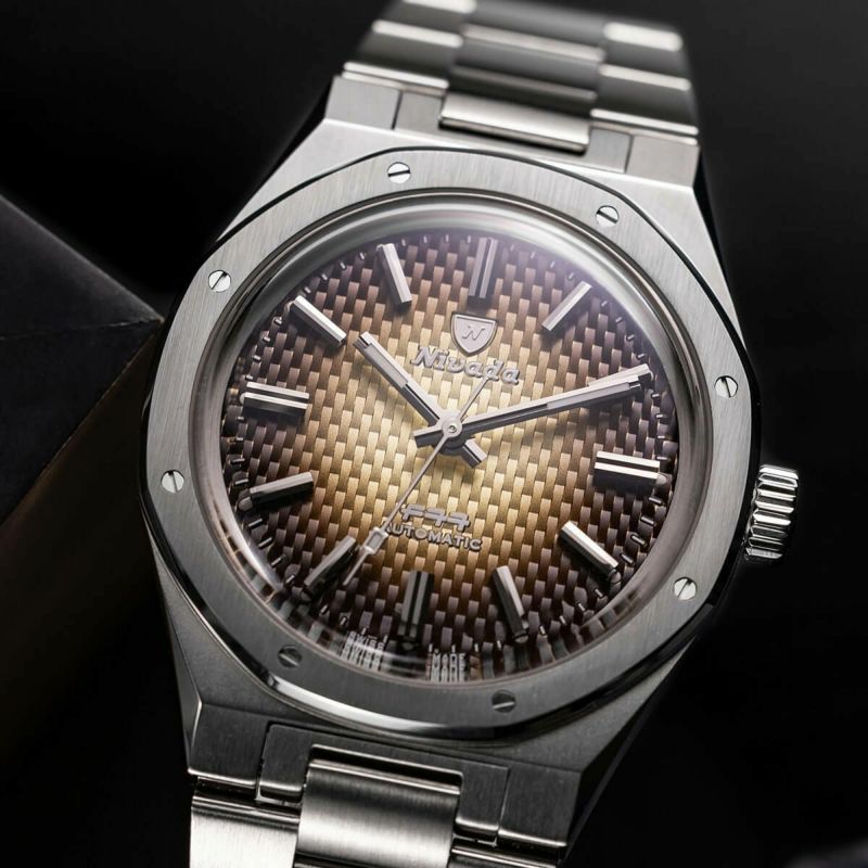 316Lステンレススチールのブレスレット専用で、F77はオリジナルのデザインに忠実で、37mmのサイズで再登場しました。このモデルは、「カーボンエフェクト」のバスケットウィーブダイアルに、しっかりとしたバトン型のインデックスが施されています。バトンスタイルの時針と分針は、スチールケースの洗練されたスリムさを反映しています。厚さがわずか12.65mmと非常に薄型なので、装着感が素晴らしいです。F77は、スイス製のSOPROD P024自動ムーブメントを搭載しており、日付表示の有無(ゴーストポジションなし)を選択でき、パワーリザーブは38時間です。