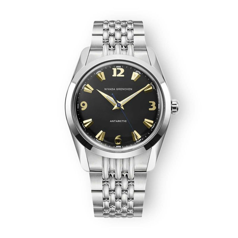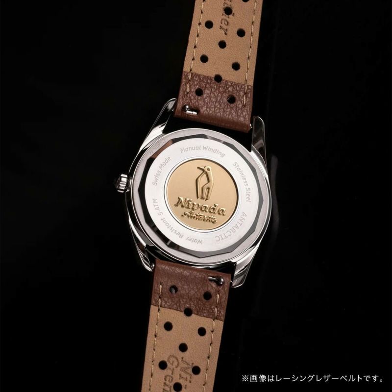 文字盤の12時位置の下には「Nivada Grenchen」のサイン、6時位置のすぐ上には「Antarctic」の文字が堂々と配され、その下にはミニッツトラックの外縁に沿うように「Swiss」の文字が控えめに配されている。