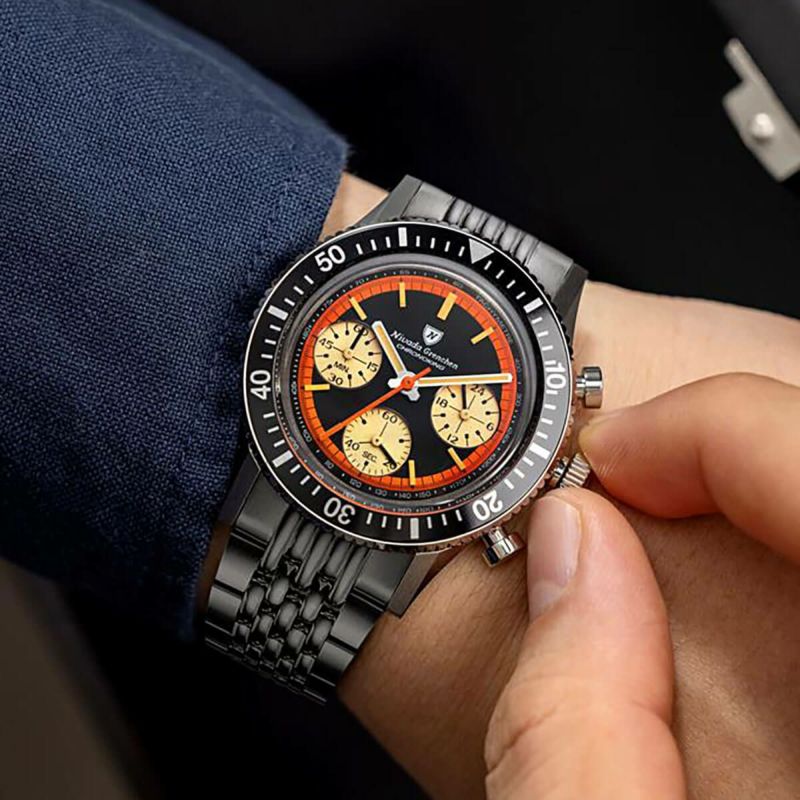 スイスで組み立てられたニバダ・クロノキングは、信頼性の高いセイコーVK63Aメカクォーツ・ムーブメントを搭載しています。