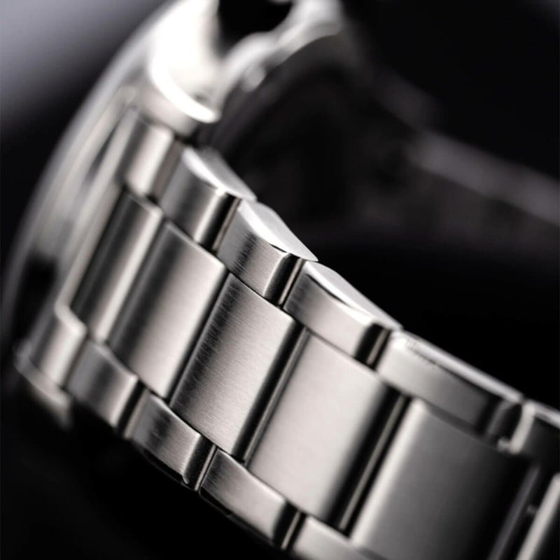3連リンクのブレスレットには、エッジの面取りやハーフリンクによるサイズ微調整、そしてNodus独自のアジャスタブルクラスプを採用。出先でも快適にフィット感を調整でき、タフさと快適性を高い次元で両立しています。