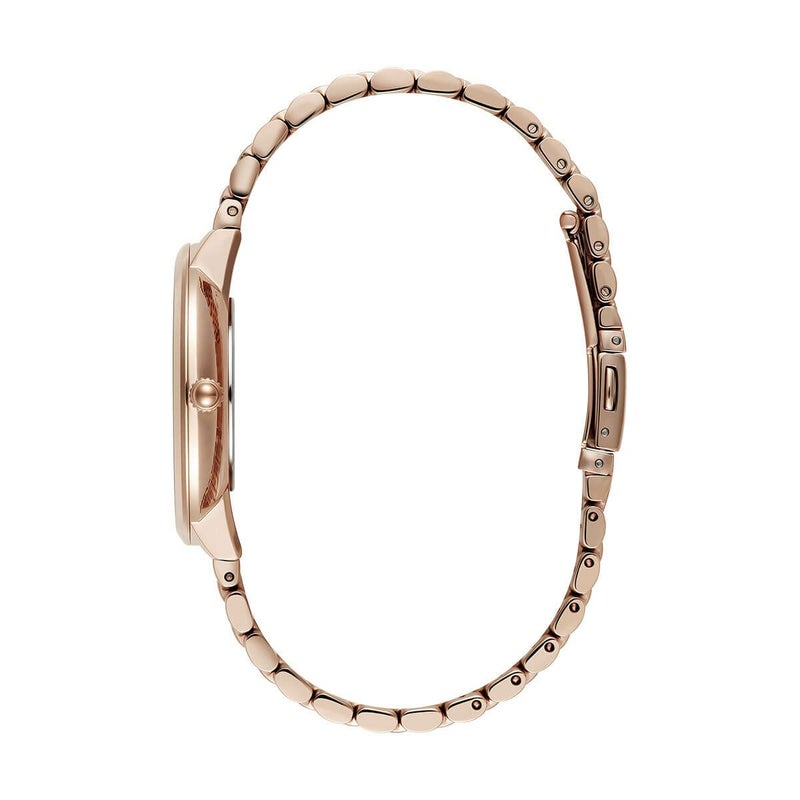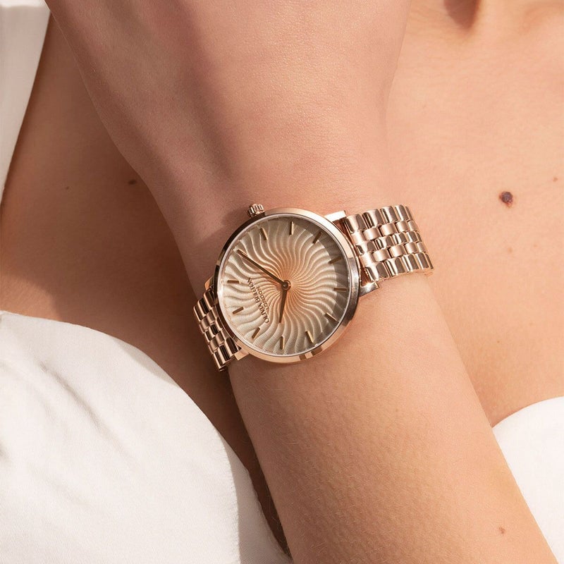 「ラディアントサン」は、光り輝く太陽からインスピレーションを得たデザインが特徴。ダイアルにはキラキラとしたメタリックなウェーブ柄が施され、細やかなテクスチャーが波打つ光線表現し、絶妙なグラデーション効果を演出している。スリムな35mmケースとクラシックな5リンクブレスレットストラップにより、遊び心を持ちながらも洗練されたコンテンポラリースタイルが完成した。