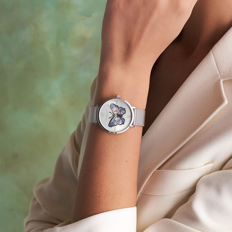 「シグネチャーバタフライ」は、その名の通りオリビア・バートンの代表的なバタフライモチーフを配した腕時計。ヴィンテージプリントからインスパイアされた美しくて優雅なフラワーパターン模様の羽が特徴で、光沢のあるサンレイダイアルの中央で圧倒的な存在感を放つ。厚さ約6.7mmの超薄型ラウンドケースとエレガントなストラップが、肌に寄り添う着用感と腕元での華やかな印象を演出する。