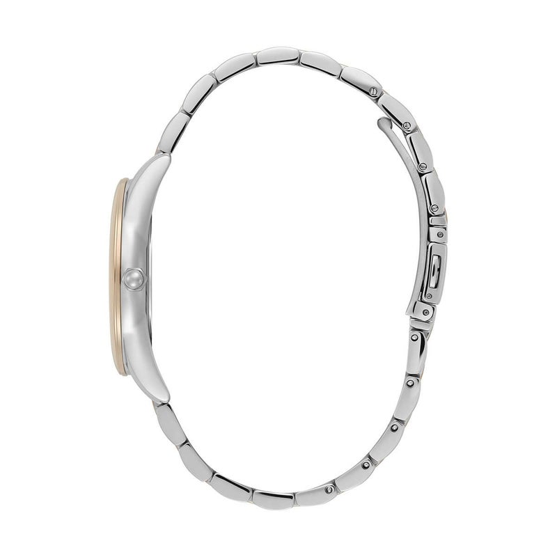すっきりとしたケースとミニマルなインデックスに、中央をマットに仕上げたローズゴールド×シルバーのツートンブレスレットを組み合わせ、女性らしいやわらかな印象に。