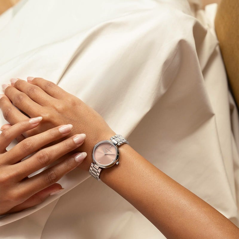 柔らかなメロウローズのサンレイダイヤルと、シルバートーンのブレスレットが織りなす上品な輝きが、あなたのスタイルを格上げします。