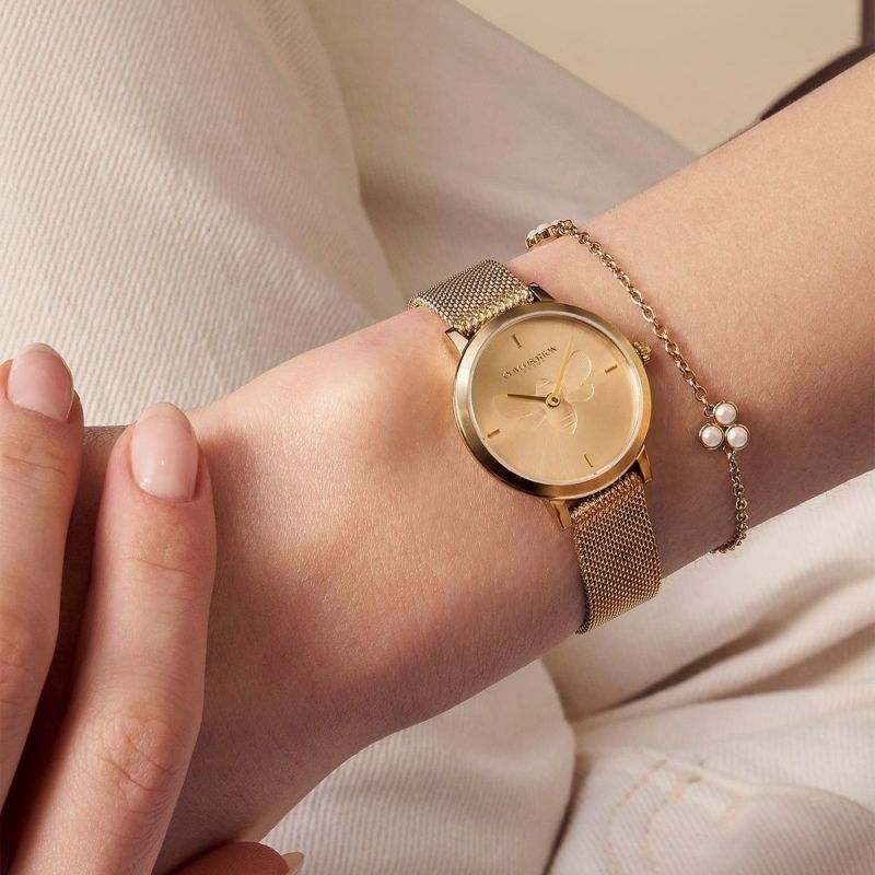 植物から動物をモチーフにしたシグネチャーコレクションは、私たちを取り巻く世界からインスピレーションを得ています。この「シグネチャー ビー ウォッチ」は、28mmのシルバーサンレイダイアルに繊細な蜂のモチーフが描かれています。モダンなメッシュストラップと極薄のケースで仕上げ、繊細で重ね付けしやすいデザインです。