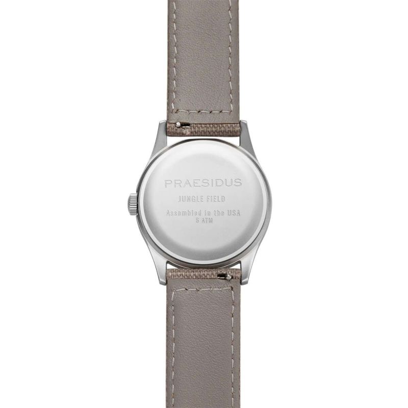 Praesidus Watch Co.では、アイコニックなフィールドウォッチデザインのオリジナルサイズをアレンジすることで知られています。ジャングルフィールドも例外ではなく、ケース直径34mmで作られています。やや小ぶりながらも、そのサイズが際立ち、手首にしっかりと存在感を放ちます。さらに、小さな直径と薄い側面プロファイルにより、腕に引っかかることがなく、快適な装着感を提供します。