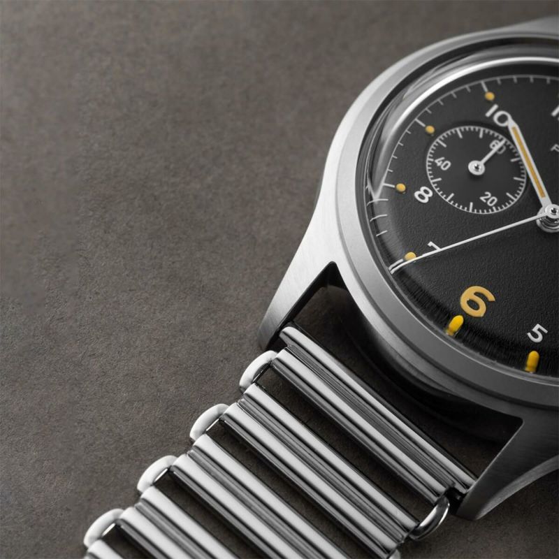 Bonklipブレスレットは一見奇妙な組み合わせですが、1940年代のフィールドブレスレットが70年代の軍用クロノグラフにこれほど合うとは驚きです。このブレスレットは非常に軽量で、構造のおかげでフィールドウォッチに最適な柔軟なフィット感を提供します。光沢のある仕上げはPAC-76のケースとも相性が良く、フィールド感とエレガントさを兼ね備えた外観を実現しています。