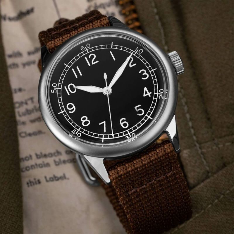 当初、A-11は基本的な手巻きのハッキング機能付きムーブメントを搭載していましたが、これらのムーブメントは時には信頼性に欠け、戦闘の厳しい環境では壊れやすいものでした。そこで、私たちはアリゾナ州を拠点とするFTS社の超精密で頑丈なアメリカ製クォーツムーブメント、Ameriquartz 6130をA-11 Specに採用しました。1940年代のオリジナルと同様に、A-11 Specもアメリカ製ムーブメントを搭載し、ペンシルベニア州にある自社組立ラインで組み立てられます。アメリカの時計製造が終わったなんて誰が言ったのでしょうか?