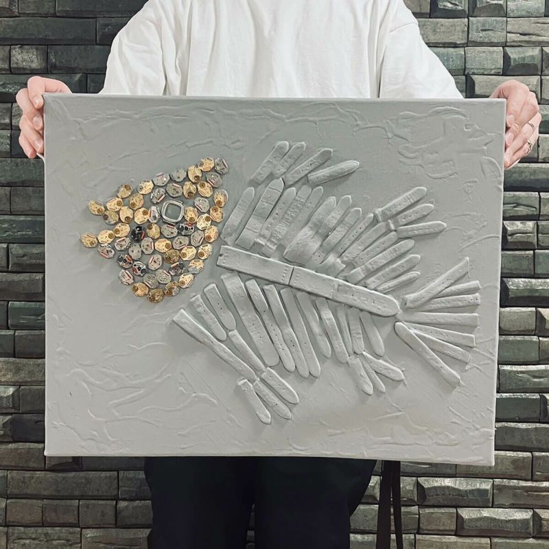 使われなくなってしまった革のベルトを骨に見立てた魚の化石です。普段は見ることの無いキラキラと光るムーブメントを鱗のように貼り付けて顔にしました。新しい世界へと泳いでいきます。