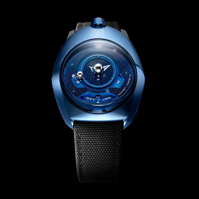 6時位置には、傾斜した窓から日付と月が現れ、インデックスもまた船窓を思わせる形状で統一。深宇宙ブルーのPVD加工を施したチタンパーツが、宇宙船のハッチのような神秘的な雰囲気を演出します。